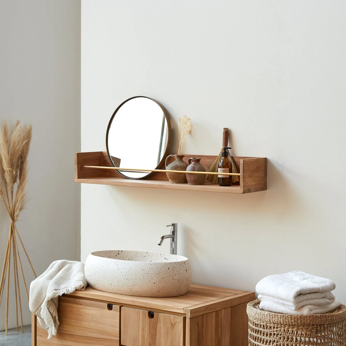 Beaucoup d’allure pour l’étagère murale de salle de bain en teck massif certifié FSC® et laiton Sasha 100, un petit meuble aussi pratique qu’élégant !