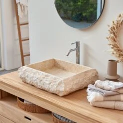 La vasque en marbre Scrula Slim cream, un trĂ©sor d’originalitĂ© et d’authenticitĂ© ! TaillĂ©e dans un bloc de marbre – une matière noble et Ă nouveau très en vogue dans les intĂ©rieurs contemporains – elle joue l’opposition des traitements : lisse Ă l’intĂ©rieur pour ĂŞtre facile Ă nettoyer, brut Ă l’extĂ©rieur pour laisser s’exprimer le cĂ´tĂ© nature du marbre.