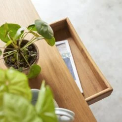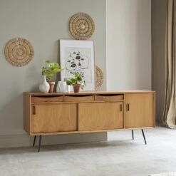 Le buffet en teck 170 Simen : astucieux, fonctionnel, esthétique… il fait l’unanimité ! Ses tiroirs façon plateaux glissés dans des niches lui confèrent beaucoup d’originalité. Le grand compartiment fermé par deux portes coulissantes et celui fermé par une porte battante organisent le rangement avec talent. On aime la blondeur du bois et le côté graphique des pieds en métal montés en oblique. S’il est parfait au séjour pour recevoir toute la vaisselle et le linge de maison, il sait aussi se mettre très en vue au salon pour accueillir le matériel nécessaire aux instants de convivialité. Pour peu que vous ayez un grand bureau, il accueille avec élégance et efficacité tous vos dossiers.