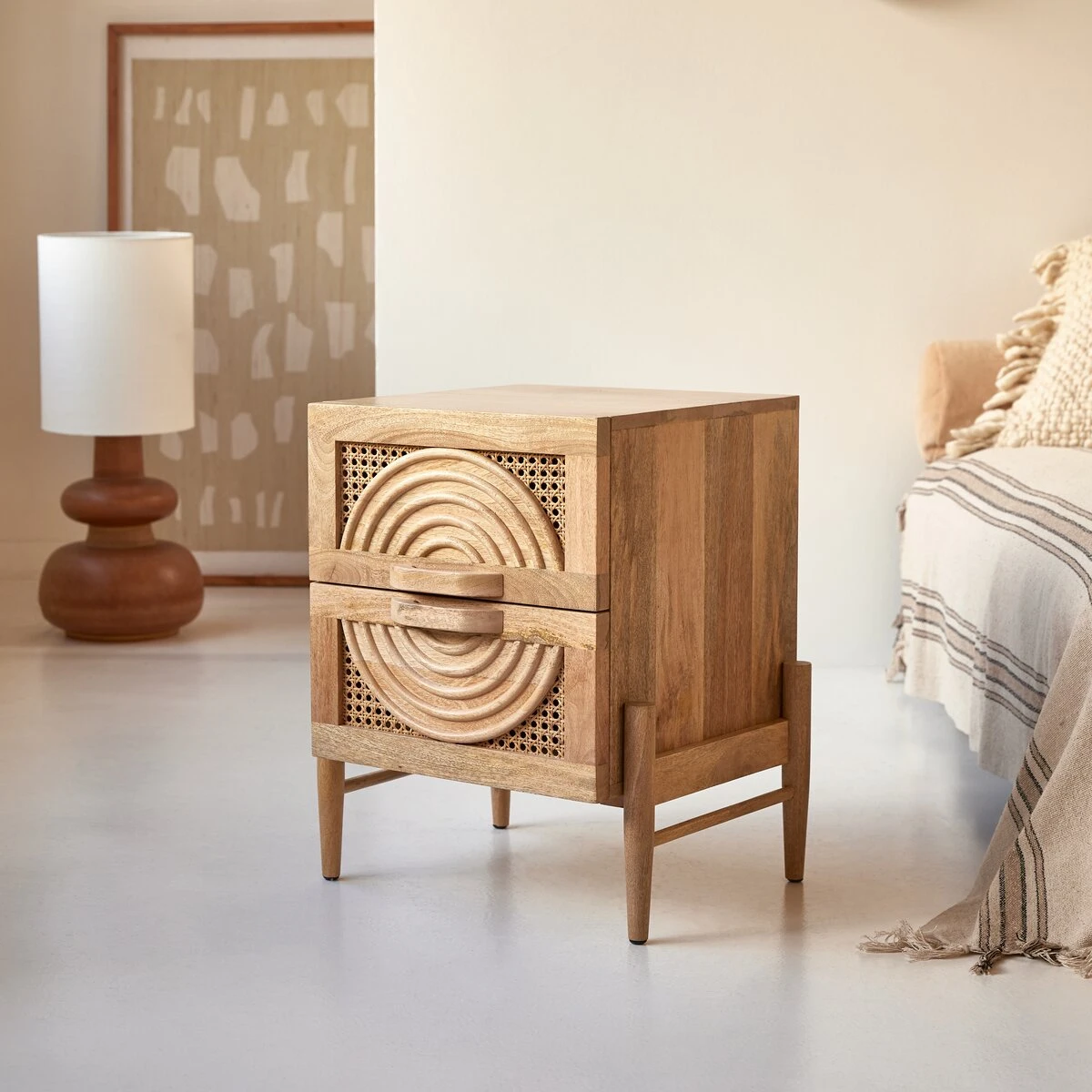 Le chevet Sina en manguier massif et rotin conjugue originalitĂ© et inspiration nĂ©o-ethnique. La façade, en rĂ©alitĂ© deux tiroirs bien pratiques pour ranger lunettes, magazines, tĂ©lĂ©commandes et tous ces objets qu’on aime avoir Ă portĂ©e de main… offre un très beau dĂ©cor en bois et cannage : les deux tiroirs fermĂ©s composent alors l’ornement complet. IdĂ©al associĂ© Ă nos tĂŞtes de lit en rotin, ce chevet complète avec brio une chambre aux accents bohèmes. Il peut aussi composer la petite touche d’originalitĂ© dans une chambre plus classique : la blondeur de son bois autorise de nombreuses associations mais si vous aimez sa personnalitĂ© venue d’Ailleurs, n’hĂ©sitez pas Ă lui associer d’autres meubles de notre collection Sina, comme la commode ou le banc TV. Â