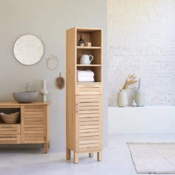 La colonne en chĂȘne Soho prend trĂšs peu de place au sol pour une capacitĂ© de rangement maximale : 1 placard fermĂ© par une porte Ă façade lattĂ©e + 1 tiroir + 3 niches⊠De quoi rĂ©partir astucieusement linge de toilette, accessoires et produits de beautĂ© !