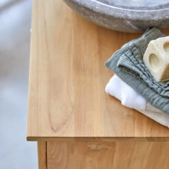 ElĂ©gance naturelle et charme intemporel pour le meuble de salle de bain en teck massif Soho. Son design minimaliste est relevĂ© d’une très belle conception lattĂ©e, très en vogue dans les intĂ©rieurs contemporains. Conçu pour durer, il accompagne votre quotidien sans jamais se dĂ©moder. On aime sa judicieuse capacitĂ© de rangement qui lui permet d’accueillir le linge de toilette et les accessoires… et les poignĂ©es en mĂ©tal brossĂ© du plus bel effet. IdĂ©al pour recevoir une vasque Ă poser que vous choisirez selon votre goĂ»t et votre budget – terrazzo premium, cĂ©ramique, marbre, pierre… , il peut ĂŞtre complĂ©tĂ© de la colonne en teck massif Soho assortie.