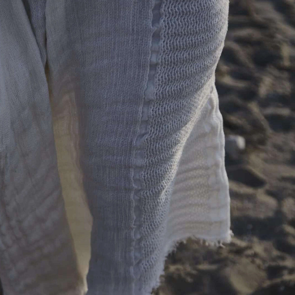 Légère, texturée, pleine de charme, la fouta en lin Sore milk, signée Autumn Paris s’apprécie encore plus avec le retour des beaux jours… Inspirée du linge d’autrefois, elle offre des finitions frangées qui accentuent encore son esprit romantique. Sur la plage pour s’allonger sur le sable ou en guise de paréo, en dessus de lit ou en jeté de canapé dans la maison, la fouta sait se plier à vos besoins. Travaillée dans un jacquard de lin et chanvre issus de l’agriculture biologique -des fibres qui ont donc été cultivés sans pesticides, insecticides ou engrais chimiques et ne contiennent pas d’OGM- cette jolie fouta est certifiée OEKO-TEX®, la garantie qu’elle ne contient aucune substance chimique.