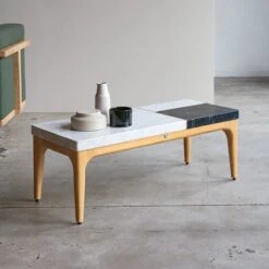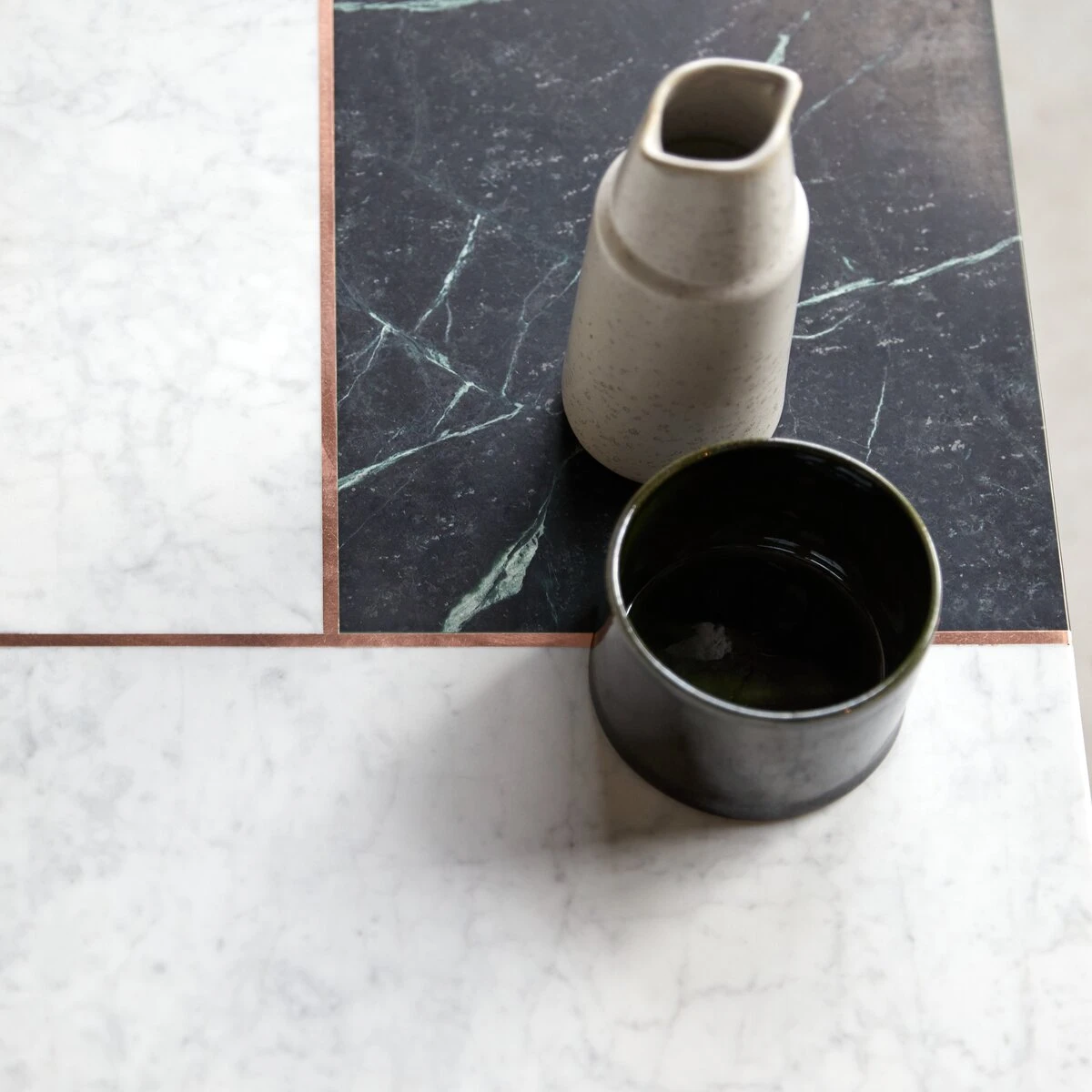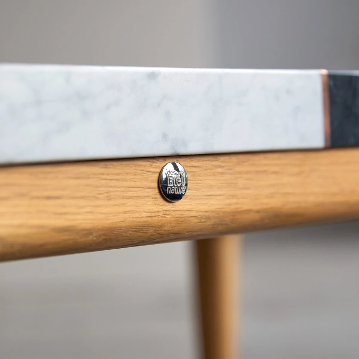 On aime lâoriginalitĂ© de son plateau graphique qui joue le contraste des marbres de couleur diffĂ©rentes (blanc + vert) rehaussĂ© de touches de cuivre⊠et son piĂ©tement en chĂȘne massif brut aux lignes adoucies.