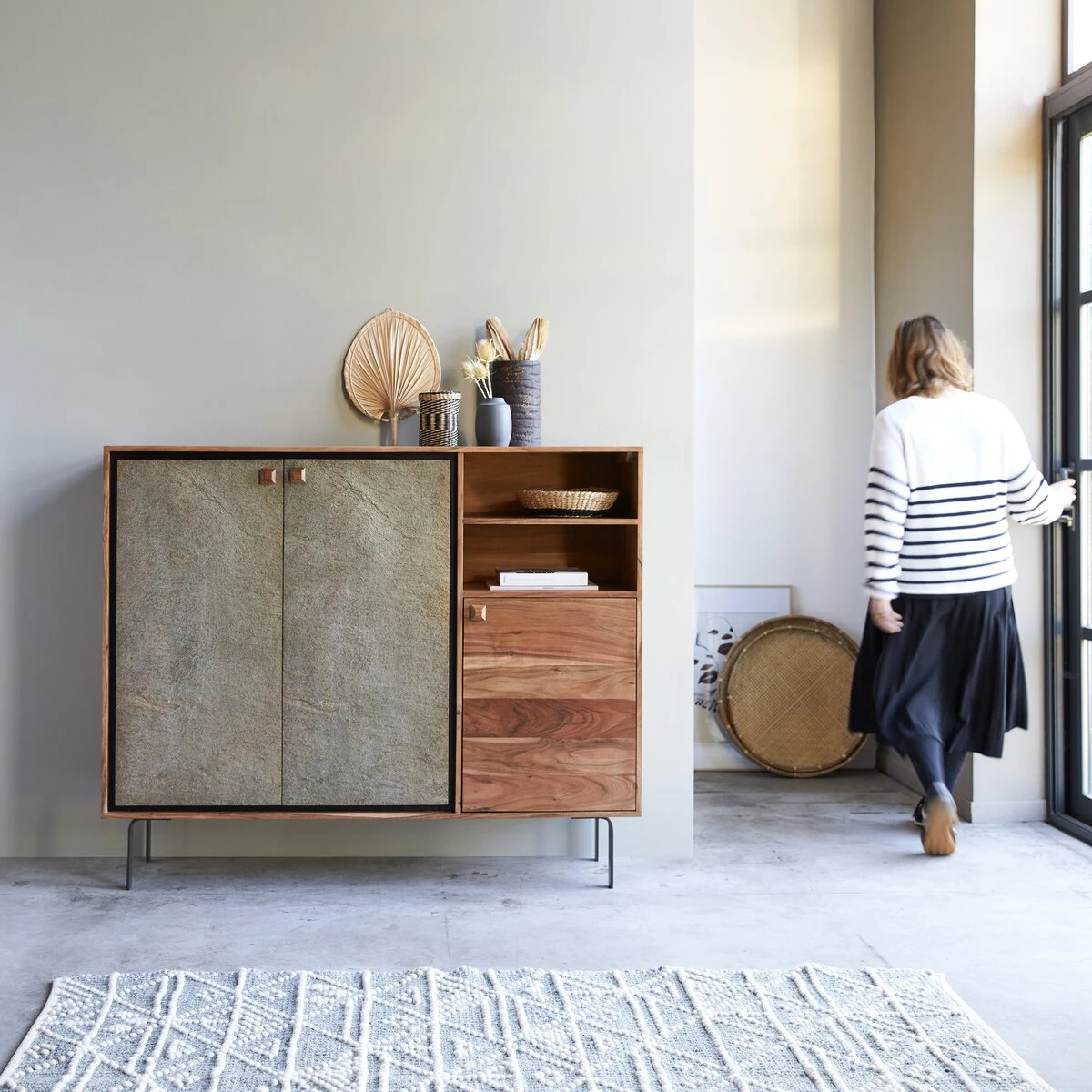 Le buffet Temis joue les contrastes de matières et de proportions.