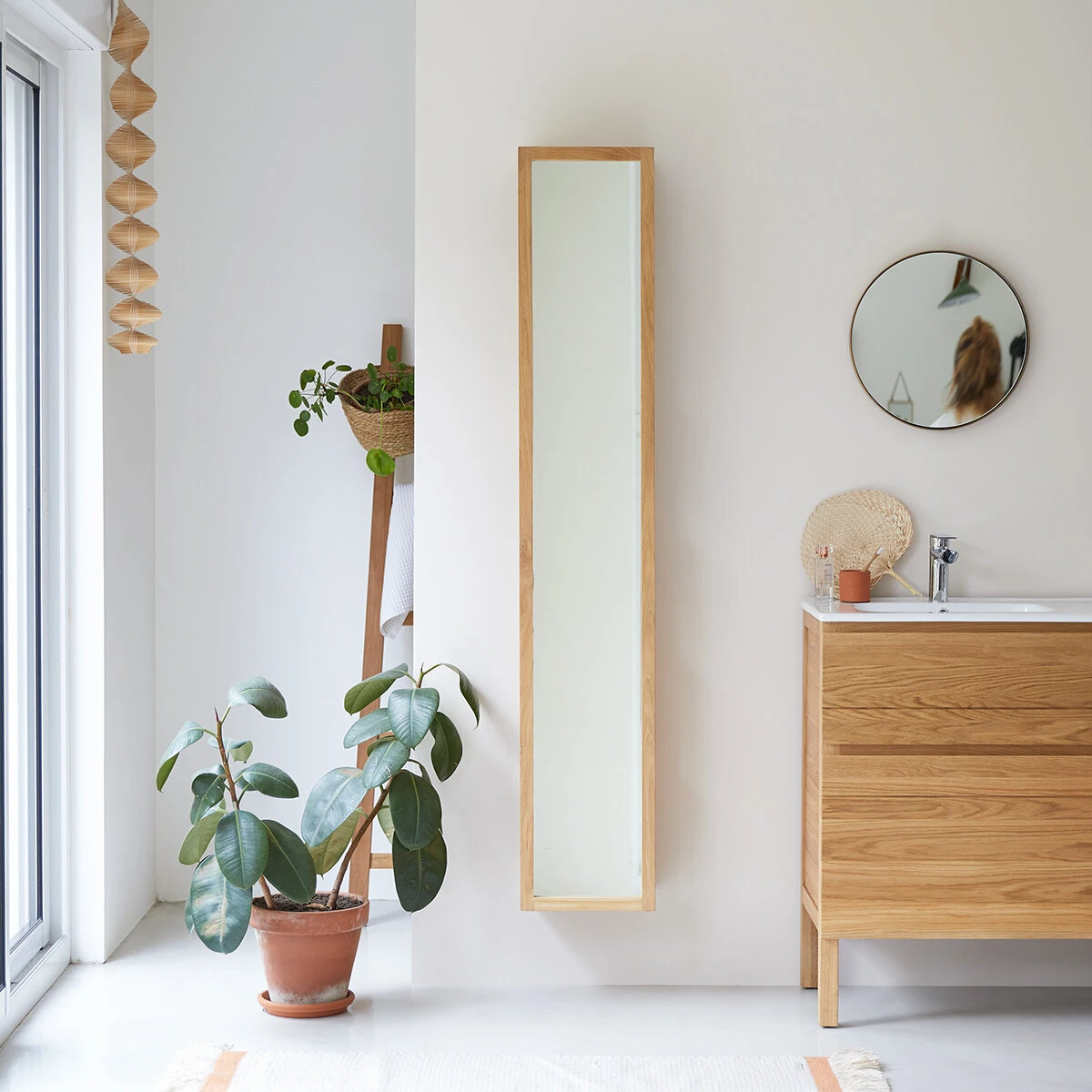 Vous ne pourrez pas rĂ©sister Ă l’Ă©lĂ©gance de ce meuble de rangement de salle de bain en bois naturel.