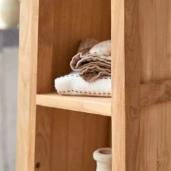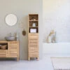 Elégante colonne de salle de bain en teck massif certifié FSC® accompagnée de son miroir.